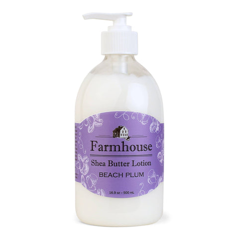 Farmhouse Shea Butter Lotion is suitable for hands and body. It contains shea butter and olive oil, a powerful combination of moisture and natural antioxidants. This lotion gets rave reviews for it's rich creamy texture and moisturizing abilities. Shea Butter is rich in natural moisture and vitamins, which can protect and heal the skin. Use this lotion daily to nourish and protect skin. 16.9 oz. Made in USA. Also Available in Hand Soap.