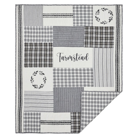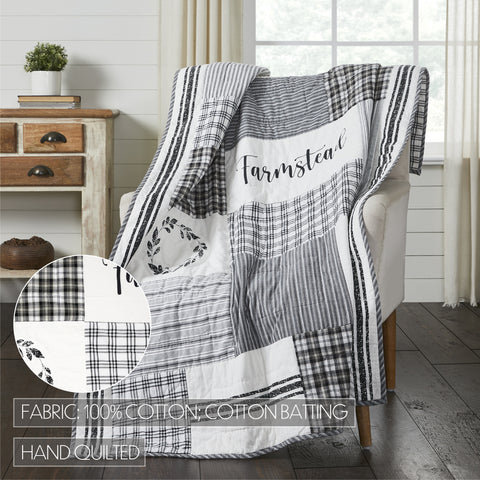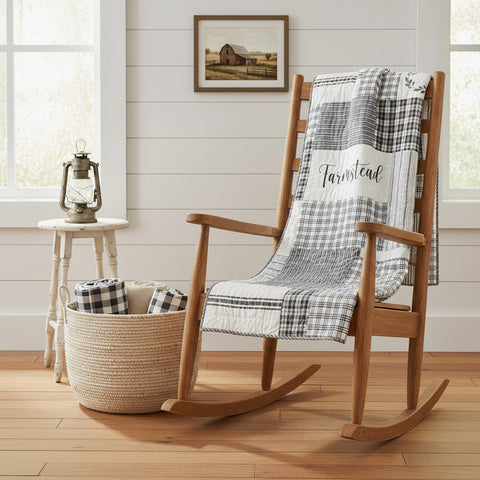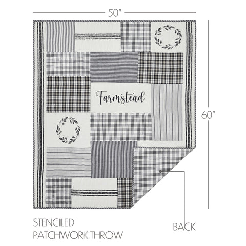 Cozy up with the farmhouse inspired Farmstead Black Stenciled Quilted Throw 60x50. Featuring stitch in the ditch and echo hand-quilting on country black and soft white fabrics with irregular block layout in various plaid and striped Farmhouse fabrics, accented by stenciled farm themes. Reverses to a charming plaid design for an alternative country look.