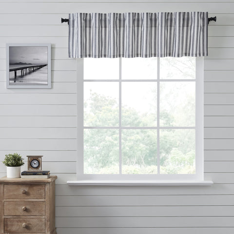 Dress up your window with the farmhouse inspired Farmstead Black Ticking Stripe Valance Curtain. Featuring repeating, solid colored country black ticking stripes woven into soft white solid cotton base. This farmhouse curtain is lined with cotton to reduce fading and light penetration; finished with a standard hem fold at the bottom to complete the farmhouse look.