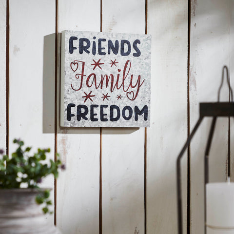 Celebrate the values that matter most with the Patriotic Friends Family Freedom On Galvanized Metal Print MDF Block Sign 10x10x1. This decorative sign features the heartfelt quote "Friends, Family, Freedom" printed in bold black and burgundy lettering on a galvanized metal look print, creating a rustic yet polished look. The metal print base is securely attached to an MDF wood block, blending industrial charm with farmhouse warmth. Perfect for indoor display, this square sign complements a variety of spaces, including living rooms, dining rooms, kitchens, bedrooms, bathrooms, or entryways. Its classic Americana-inspired color palette of galvanized grey, black, and burgundy pairs beautifully with rustic, country, and farmhouse-style interiors. Whether showcased as part of your Independence Day decor or as a year-round reminder of cherished values, this sign adds warmth and character to your home.Â