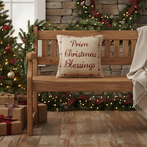 Add warm holiday style with this primitive Christmas accent pillow. The Prim Christmas Blessings Pillow measures 12 by 12 inches. The filled pillow features word art reading, Prim Christmas Blessings surrounded by a matching burgundy border of berries and five-point stars for a simple primitive look with seasonal flair. The cozy home accessory reverses to a plain tan fabric. Spot clean as needed.
