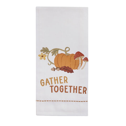 Add a Fall touch to your kitchen with our Gather Together Dishtowel. Features channel stitching with pumpkin, acorn and mushroom accents!