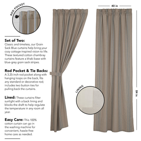 Classic and timeless, our Grain Sack Blue Panel Set 84X40 helps bring your cozy cottage-inspired vision to life. Perfect for any season, these textured cotton chambray curtains feature a khaki base with blue-grey grain sack stripes. This refreshing window treatment coordinates effortlessly with our Farmer's Market bedding collection for a complete look in your vintage-style bedroom. Give your curtains a simple refresh and let in natural light with our matching cloth tie-backs included.