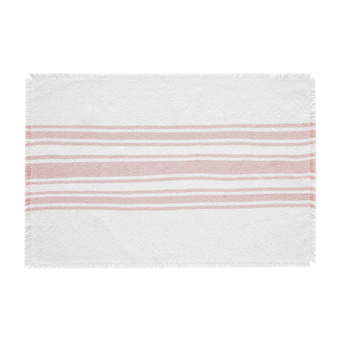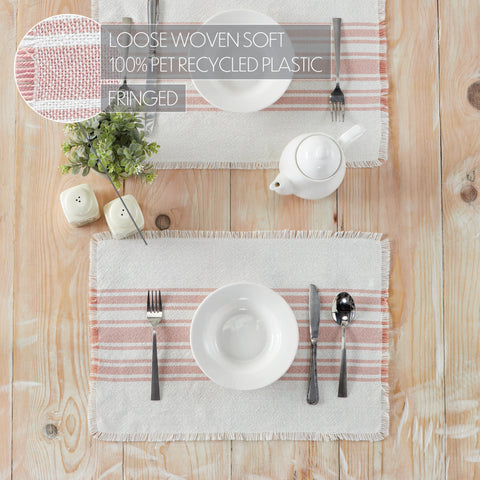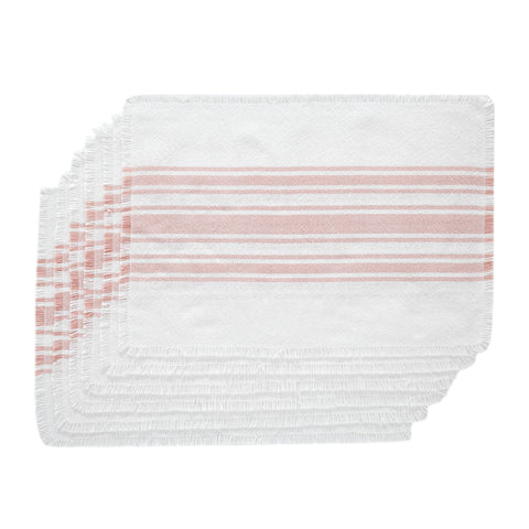 Create a joyful table both inside and out for friends and family to gather round with modern color and a classic design. The Grain Sack Stripe Coral Placemat Set of 6 includes a set of six placemats measuring 13x19 inches. The frayed edging and the vintage grain sack style design are given a modern twist with soft coral color and recycle PET material for a water-resistant fabric that can be used on traditional tabletops, or for sprucing up a patio table with farmhouse charm. Set of 6.