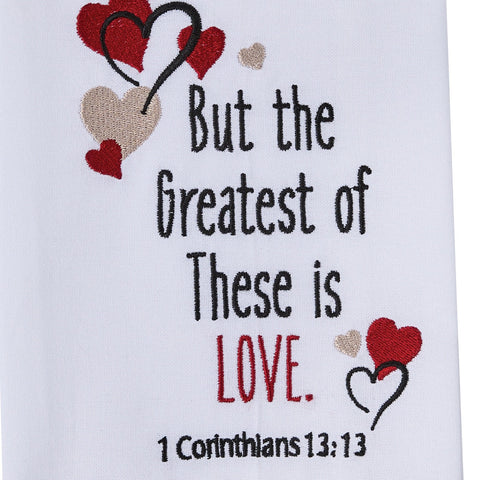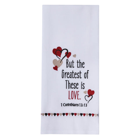 This Greatest Of These Love Dishtowel features a heartwarming embroidered message from 1 Corinthians 13:13. It makes a perfect gift for someone special, reminding them of the true power of love. Elevate your kitchen decor and spread love with this thoughtful dishtowel. It's also perfect for Valentine's Day!