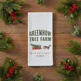 Add a Holiday touch to your kitchen with the Greenhow Tree Farm Dishtowel This dishtowel features a horse-drawn wagon with a pine tree and the words "Greenhow Tree Farm" and "Fresh Cut Classic Pines". will serve as the perfect kitchen décor and/or gift. Measures 18" x 28". Towel Color: red, green and white, brown. Features a horse leading a wagon with tree.