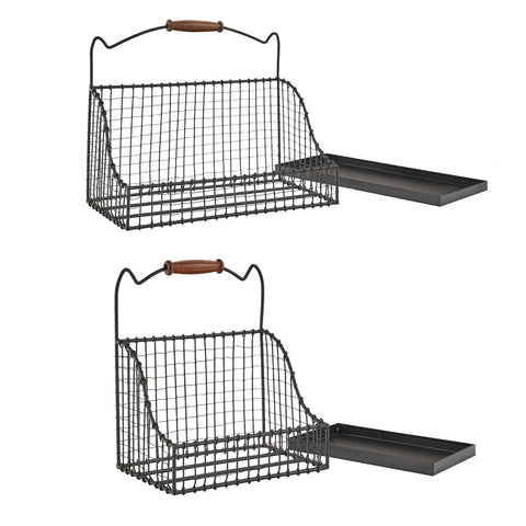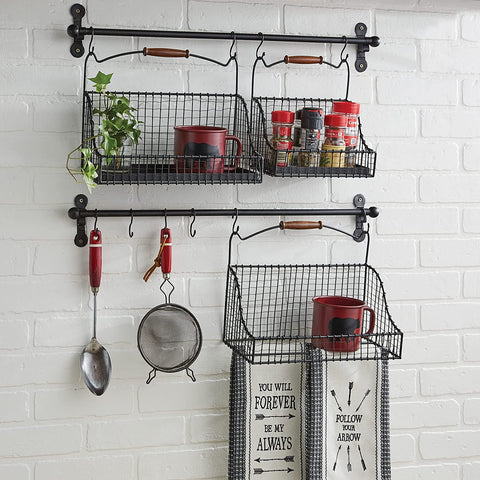 Our Hanging Wire Basket Set of 2 is an stylish solution for organizing and displaying. The two-piece set features a black metal wire design with wood handle. Set of 2 baskets in one of each size. Metal Bar is sold separately.