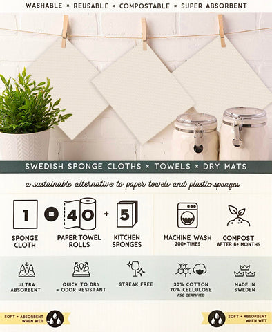 Made from cotton and plant-based cellulose fibers, these eco-friendly compostable Swedish Dishcloths are an established must-have. They offer a sustainable alternative to sponges, dishcloths and paper towels and become soft and pliable when wet for easy clean-up. A sustainable alternative to paper towels.