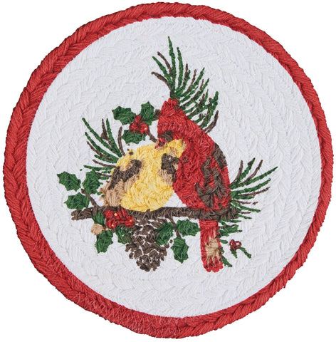 Protect your kitchen counters and table in farmhouse style with our Holiday Cardinal Love Braided Round Trivet 8" Set of 3. This 8 inch rustic table trivet is the perfect feature to stop heat from hot pots and pans from destroying a valued table or countertop. Dress your holiday table in primitive style offering a casual aesthetic expression of primitive colors in concentric braids of 100% cotton. Machine stitching hold braiding together even with increased wear and tear. Reverses to same as front. Set of 3.