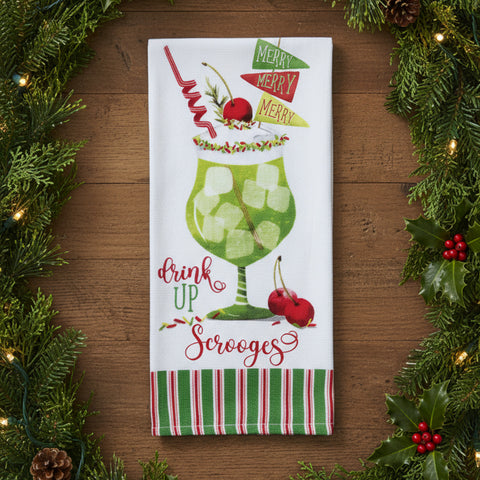 The Holiday Cheers Scrooge Dual Purpose Terry Towel is a fun and festive towel for celebrating the Christmas season! Showcases a Holiday drink and the phrase "drink UP Scrooges". Perfect addition to your holiday and winter decor. Dual purpose towels have a classic flat weave front face for drying glassware (and non-pilling!) with an absorbent Terry cloth backside for everyday kitchen tasks.