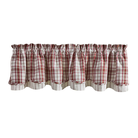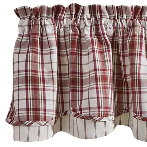 The Homestyle Lined Layered Valance features a double layer of beauty! The top layer offers a striking plaid of red wine, brown and off white plaid. Underneath is a coordinating stripe with fabric buttons as the perfect finishing touch! Lovely on its own, or pair with coordinating tiers for a more dramatic look (as pictured / sold separately). Lined.