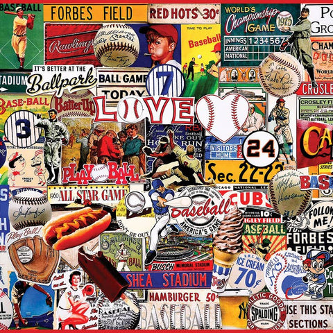I Love Baseball. Famous fields of past and present are represented in this 1000 piece collage style jigsaw puzzle. Artist Charlie Girard gathered vintage images that will reignite your love of the game while bringing back memories of the past and hope for the future. Finished size 24" x 30".