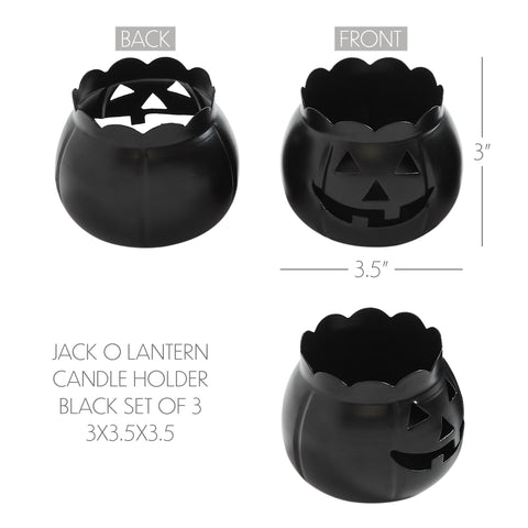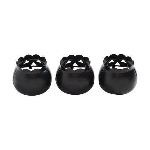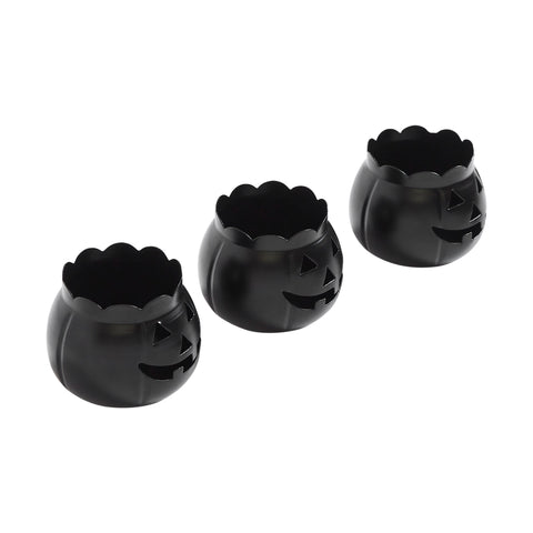 Add a spooky touch to your fall and Halloween decor with the Jack-O-Lantern Candle Holder Black Set of 3. These pumpkin-shaped tealight holders, measuring 3x3.5 inches, feature a classic Jack-O-Lantern face with a scalloped rim. The deep black color adds a bold, rustic element to your Halloween decorations, making them perfect for placing on your dining table, kitchen counter, or any area of your home that could use a bit of eerie charm. Crafted from durable metal, these primitive and rustic candle holders bring a timeless Halloween aesthetic to your home. The solid black color enhances the carved pumpkin face, creating a dramatic contrast that captures the essence of spooky season.
