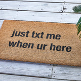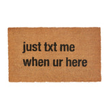 Greet your guests with a little light-hearted fun with the Just Text Me Door Mat. This eco-friendly coir coconut fiber door mat features the phrase "just text me when ur here" in natural and black on natural fiber. Durable bristles absorb moisture & trap dirt.