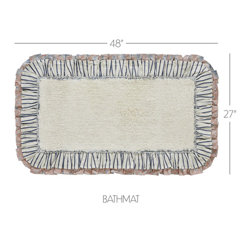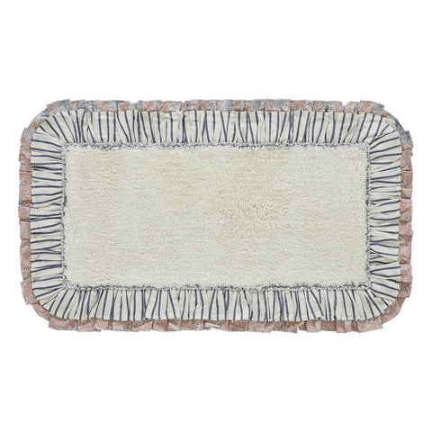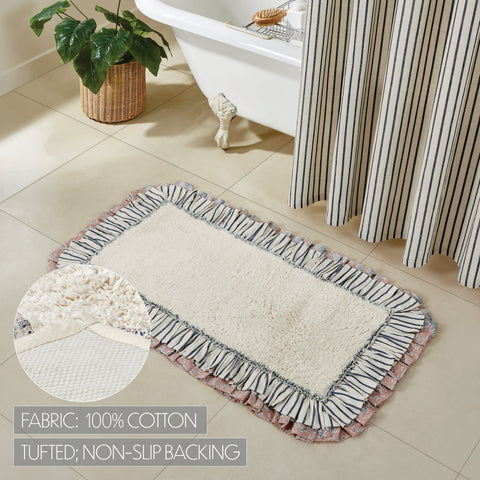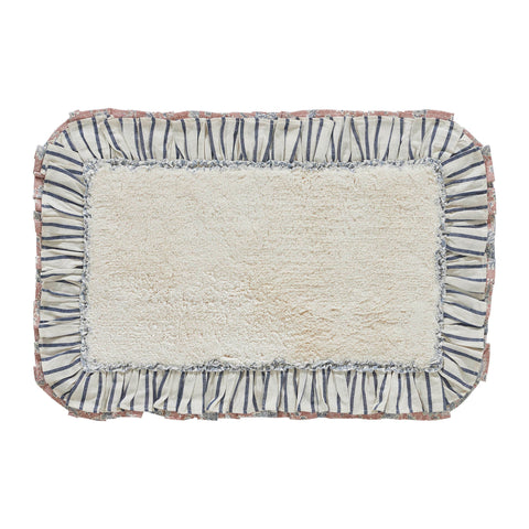 Step out of the shower and into cozy country farmhouse bliss. Our Kayley Ticking Blue Bath Mat features a solid creme core in premium, ultra absorbent cotton. It is trimmed with a ruffled vintage striped fabric in navy blue and creme layered with a vintage floral in misty rose. Backed with textured rubber to produce a quality, non-slip surface without the need for a separate rug pad. This ruffled bath mat is a great finishing piece for bathrooms or laundry rooms where you need the perfect balance of style and functionality.