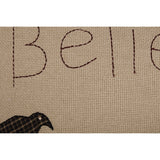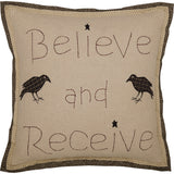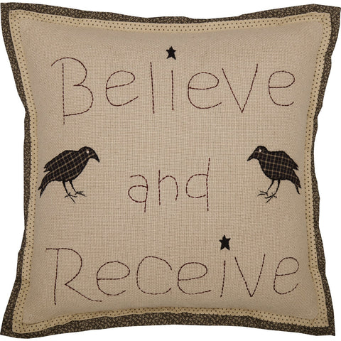 Decorate your home with a touch of warmth and old-fashioned essence this Christmas. The Kettlehurst Believe and Receive Pillow adds simplicity and rustic charm to your home with beautifully embroidered "Believe and Receive" in burgundy on a vintage tan background surrounded by primitive crows designed in plaid. This filled pillow is finished with a solid tan base color and button closures on the reverse side with a ditsy flower print trimmed around the edge to complete the look. Place this primitive holiday throw pillow on your favorite chair or anywhere you see fit to match your country decor.