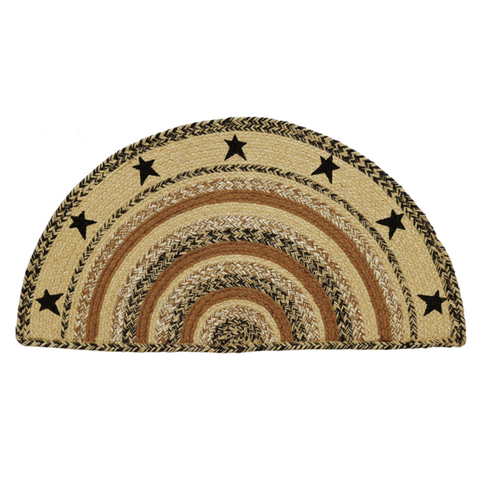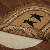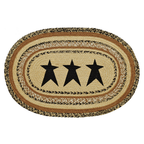 Bring a primitive touch to any room with the braided area Kettlehurst Jute Rug Oval Stencil Star. Featuring stenciled black primitive stars in the center and alternating braids in black, warm creme and soft caramel brown.
