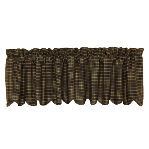 Bring a primitive look to any window with the Kettlehurst Plaid Valance Scalloped. This primitive curtain features black and tan plaid, lined with cotton and finished with a scalloped edge for a special, classic touch.
