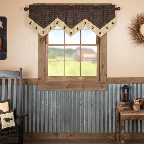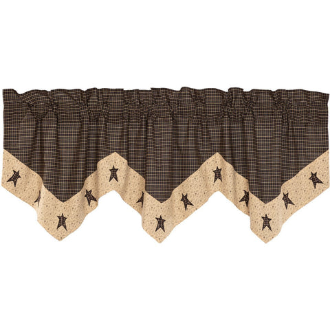 Go for a down-to-earth classic country look with the Kettlehurst Star Valance. Featuring a favorite primitive star design on a pointed-edge trim with the traditional ditsy flower pattern, accompanied by plaid in black and khaki. Lined - 100% cotton.