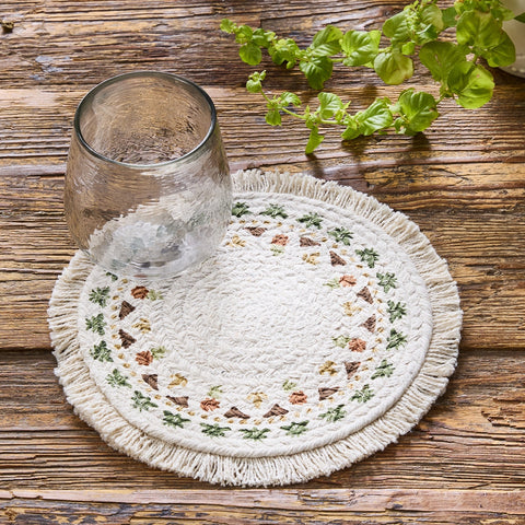 Protect your kitchen counters and table in farmhouse style with our Maisley Round Trivet 8" Set of 3. This 8 inch table trivet is the perfect feature to stop heat from hot pots and pans from destroying a valued table or countertop. Dress your fall table in primitive style offering a casual aesthetic expression of primitive colors in concentric braids of 100% cotton. Machine stitching hold braiding together even with increased wear and tear. Reverses to same as front. Set of 3.