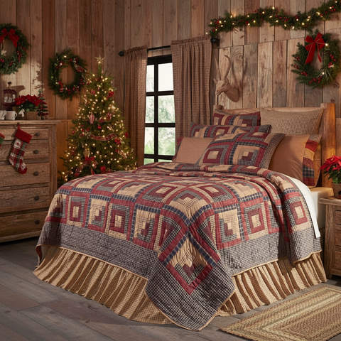 The Millbury Quilt features a country vintage log cabin patchwork design with contrasting colors of navy, burgundy, and tan, finished with a navy plaid border. 100% cotton and hand-quilting make this an heirloom quality quilt you will be proud to hand down.