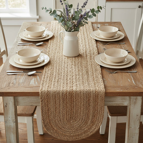 Add a simple yet classic decorative element to your table setting with our Hickory Grove Natural Braided Runner. Neutral colored braided jute beautifully transforms any table with the bonus of its efficient functionality for hot food presentations. You can dress it up with an elegant centerpiece for a party or keep it simple with a few matching place settings for a family meal. This jute runner is the perfect accent piece for any country or farmhouse kitchen.