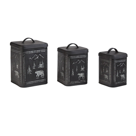 Store your dry goods in cabin country style with our Ozark Black Bear Canister Set of 3. Featuring black and galvanized grey metal, bear and mountain evergreen scene, its a great lodge style functional addition for your kitchen. Food safe and includes rubber gaskets on the lids for an airtight seal.