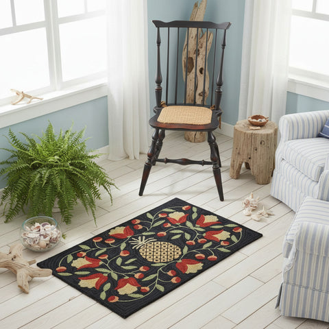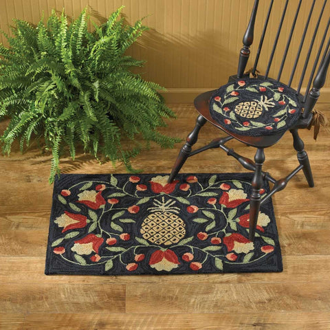 Add comfort to your home with our Pineapple & Flowers Hooked Rug. Handcrafted the rug features a Pineapple with red flowers.