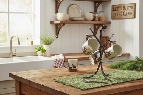 Display your favorite brew mugs in style with the Pineview Mug Rack. This rustic cabin-inspired piece holds four mugs and brings cozy charm to any kitchen or coffee nook. Perfect for keeping your go-to cups within arm's reach while adding that warm, woodsy character your home deserves. A practical touch of cabin comfort.