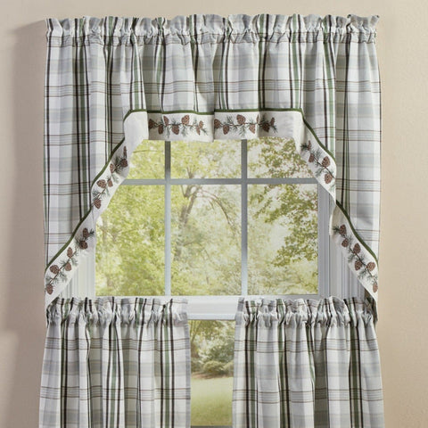 The Ponderosa Pine Swag Set tastefully features plaid of grey, white, brown and green. It's the perfect blend of farmhouse elegance and country cottage charm.   Swags include rod pocket for easy hanging.   Tiers are sold separately.