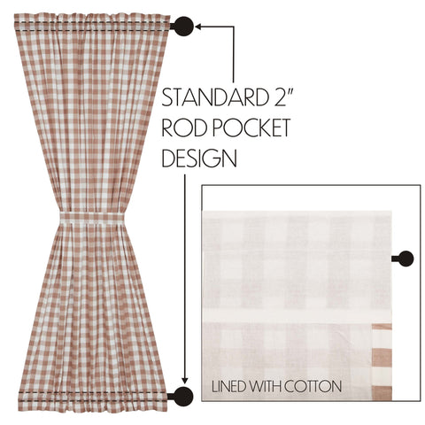 Dress up any door in your cozy cottage with a soothing southern twist. Our Portabella Buffalo Check Door Panel 72x40 features a classic buffalo check pattern in portabella brown and soft white. Crafted in 100% cotton and finished with a standard .5 inch hem fold on each side, this buffalo check door panel displays exceptional quality for any farmhouse-style home that needs an elegant finishing touch. This fashionable curtain includes 1 matching tieback with a button to wrap around the center for a different look and two rod pockets for easy hanging.