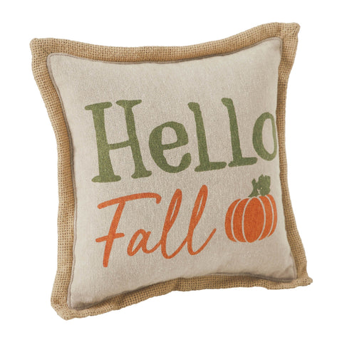 The Pumpkin Bounty Hello Fall Pillow, a charming addition to your fall and Thanksgiving decor. Crafted from a blend of cotton and polyester, this decorative throw pillow offers both durability and a soft, comforting texture, perfect for adding a touch of rustic charm to your home. Measuring 9x9 inches, its square shape provides the ideal size for accenting your bed, entryway bench, or living room sofa with autumnal flair. Embrace the arrival of the fall season with the cheerful greeting, "Hello Fall" elegantly printed on the pillow. The warm tones of tan, burnt orange, and cypress green evoke the cozy ambiance of autumn, creating a welcoming atmosphere in any room. Whether placed in your bedroom, entryway, or living room, this Pumpkin Bounty Hello Fall Pillow adds a touch of country-inspired charm to your fall decor.