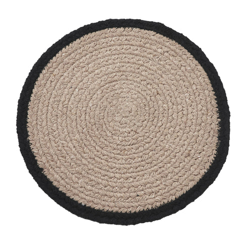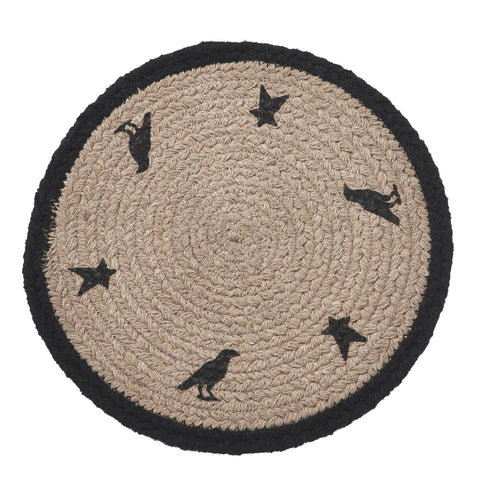 Protect your furniture in primitive farmhouse style with our Raven Braided Round Trivet 8". This 8 inch rustic table trivet is the perfect feature to stop heat from hot pots and pans from destroying a valued table or countertop. The trivet boasts a charming stencil design of primitive ravens and stars in tan and country black hues, evoking the cozy ambiance of autumn and Thanksgiving gatherings. Its graphic print and stenciled motif add a touch of rustic charm, making it an ideal complement to primitive and rustic decor styles. Hand washable for easy maintenance, this trivet is designed to withstand daily use, ensuring long-lasting enjoyment throughout the fall season and Thanksgiving festivities Sold individually.