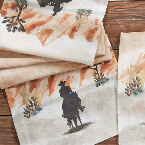 Bring the charm of rustic country living to your farmhouse table with the Rustic Trails Table Runner 54". Featuring a desert and cowboys design, it adds timeless warmth and inviting texture to any meal or gathering. Perfect for enhancing your décor with a cozy, handcrafted feel, this runner captures the essence of countryside comfort while protecting your table in style.