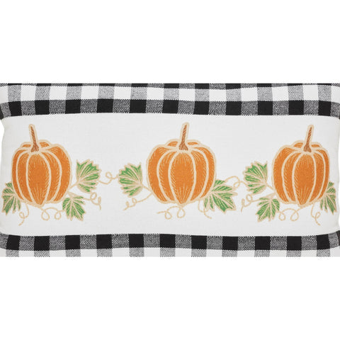 Add a burst of classic fall style with this rectangular accent pillow. The Sable Ann Check Pumpkin Patch Pillow measures 14 by 22 inches. The filled pillow features a row of three orange pumpkins surrounded by winding leaf accents. The cozy home accessory reverses to black and white buffalo plaid for casual farmhouse style. Spot clean as needed.
