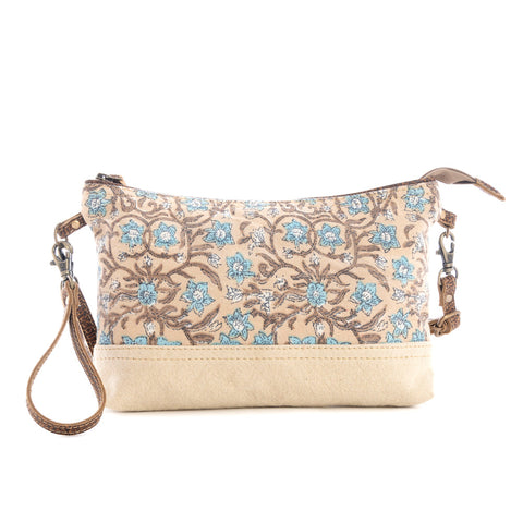 Subtle, stylish and alluring, this bag presents an enchanting floral pattern. The scene of serene foliage is embraced by soft taupe woven canvas, expertly stitched to perfection. The back includes an extra zippered pocket; the wristlet carrying strap and the detachable, adjustable shoulder strap are in matching leather. A versatile and charming bag you'll cherish!.