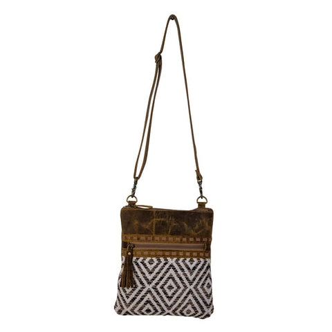 This charming bag features an upcycled woven rug with a striking tribal-inspired pattern in soothing colors. Special aged leather in rich chocolate accents the front with special stitching and a zippered pocket. The back is olive sandstone woven canvas with a zippered pocket. The interior features a zippered pocket and zipper-close top. Matching durable leather shoulder strap is adjustable and removable.
