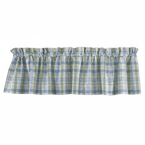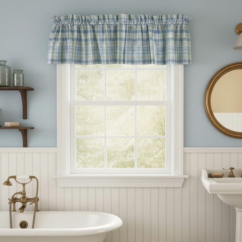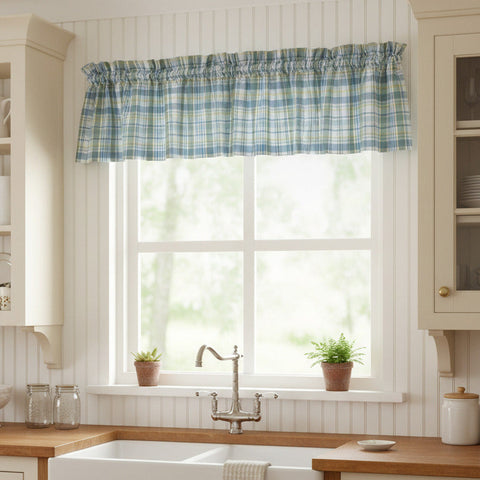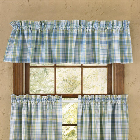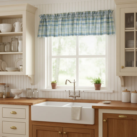 The Cornflower Valance tastefully features plaid of cornflower blue, sage green, yellow and white plaids. It's the perfect blend of farmhouse elegance and country cottage charm. Lined with 100% white cotton.   Tiers sold separately.