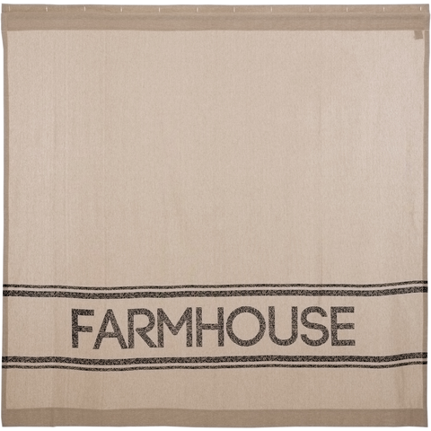 • This shower curtain contains the large stenciled word "Farmhouse" in distressed black, accented with grain sack stripes above and below