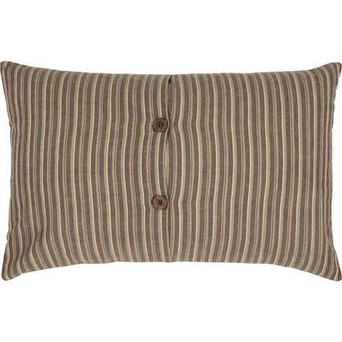 The Farmstead Charcoal Farmhouse Pillow wears its country heart on its sleeve with a large "FARMHOUSE" and a grain sack stripe above and below the wording, stenciled in distressed black, across the center. Reverses to charcoal grey, chocolate, and creme striped and 2 light wooden button closures.