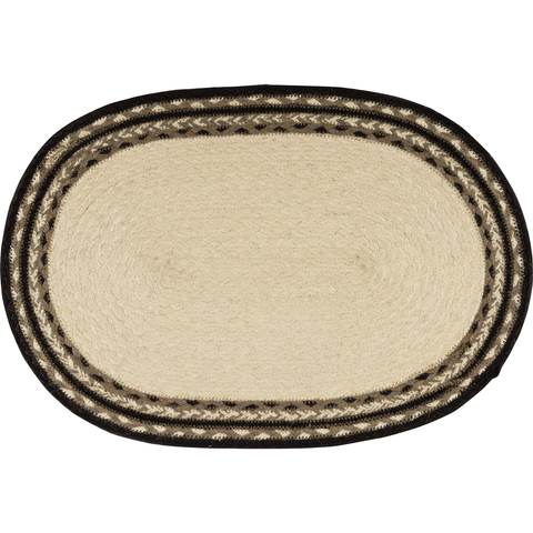 The country farmhouse Farmstead Charcoal Pig Braided Jute Placemat Set of 6 is a true "from farm to table" addition to your home. In the center of each placemat you'll find a farm pig stenciled in distressed black over ivory and surrounded by concentric braids of black, grey taupe, silver, and ivory.