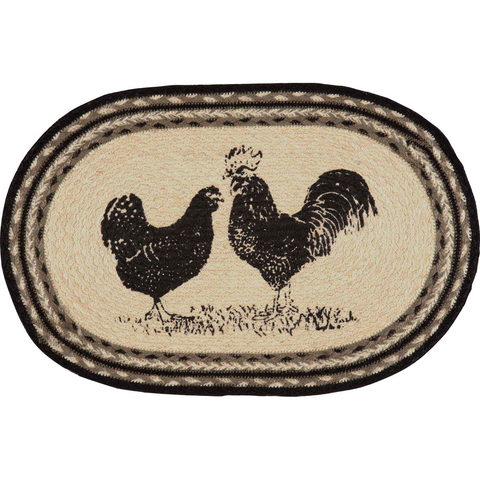 The country farmhouse Farmstead Charcoal Poultry Braided Jute Placemat Set of 6 is a true "from farm to table" addition to your home. In the center of each placemat you'll find a rooster and hen, both stenciled in distressed black over ivory and surrounded by concentric braids of black, grey taupe, silver, and ivory.
