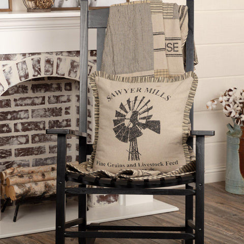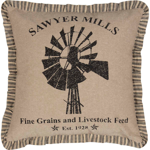 The Farmstead Charcoal Windmill Pillow brings a Farmhouse look anywhere it is displayed. With the black stenciling giving it a vintage feel, this all-cotton pillow is a khaki chambray and trimmed with a 1" charcoal grey, chocolate, and creme striped gathered ruffle and reverses to solid khaki chambray with 2 tie closures.