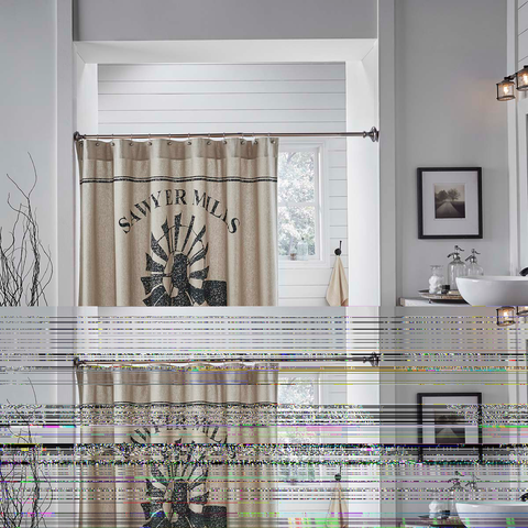 The Farmstead Charcoal Windmill Shower Curtain brings a Farmhouse Country look into the bath with its windmill-themed black stencil in the center over khaki chambray. A single grain sack stripe is stenciled both above and below the center design.