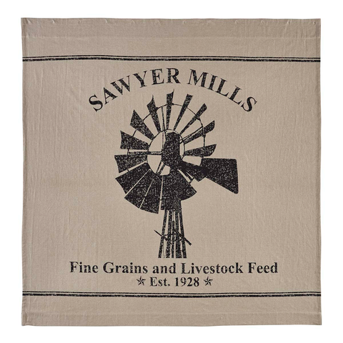 - Windmill-themed black stencil in center on khaki chambray base