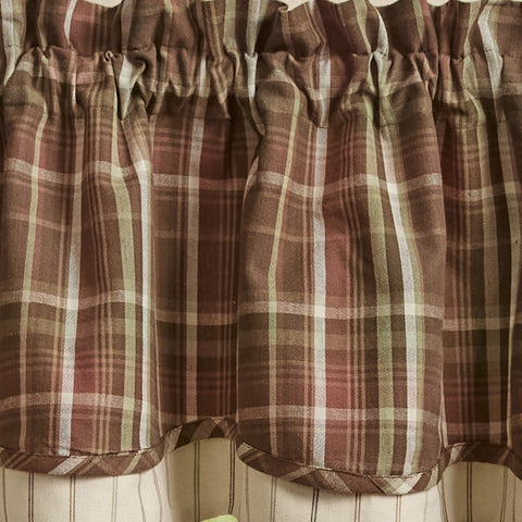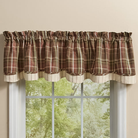 The Sexton Layered Valance tastefully combines hues of brown, white, green, tan and pink plaid layered on vertical ticking stripes. It's the perfect blend of farmhouse elegance and country charm. Lined with 100% white cotton.