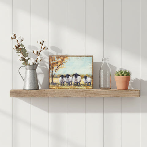 A wooden block sign featuring natural stained sides and a replication of a painting depicting sheep in a field. Design is replicated from original artwork painted onto burlap canvas, giving the art a unique depth and texture. Easily hangs by predrilled keyhole slot or can free-stand alone.