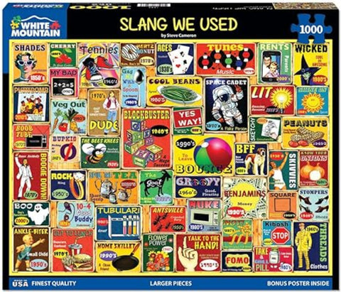 1885 Slang We Used. Talk to the hand, Groovy, Cool Beans, the Bees Knees, and many more. Artist Steve Cameron assembled a collection of slang that was popular back in the day in this 1000 piece collage style jigsaw puzzle. How many of these phrases were a part of your vocabulary? Finished size of 24” x 30”.