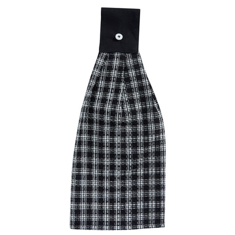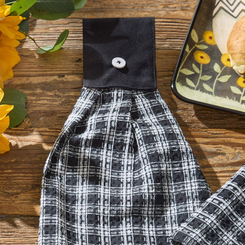 Add a farmhouse country touch to your kitchen with our Stanton Black Hang Tab Dishtowel. This hand towel will serve as the perfect kitchen décor and/or gift. It'll definitely be a wonderful addition to any color scheme.. Measures 7" x 17.75". Towel Color: black and white plaid. Velcro strap for hanging on the top accent trim.
