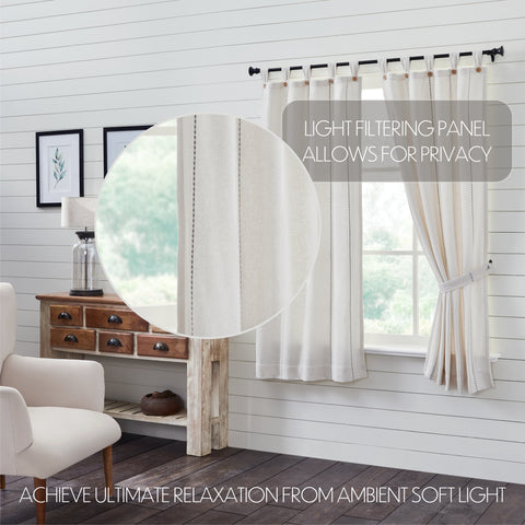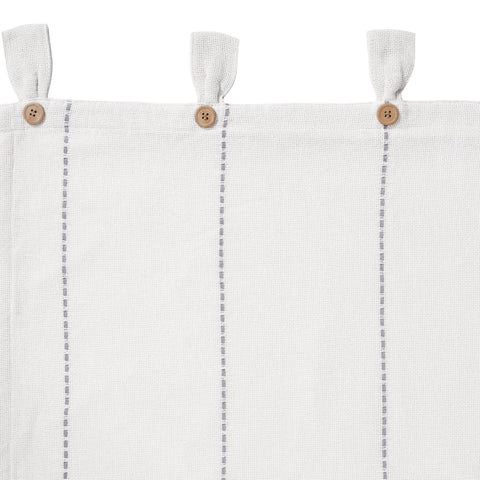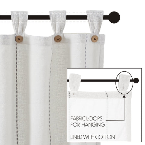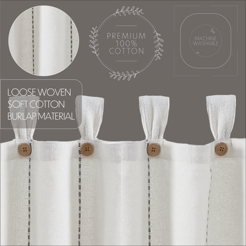Dress your windows with farmhouse decor with the 63x36 Stitched Burlap Short Panel Set of 2. Soft white cotton lines the inside of the panel with a straight edge, textured dobby weave that showcases the beautiful dove grey and soft white hues. Easily hang the cottage-style striped panels with the tab top. Comes with a set of 2 farmhouse panels.